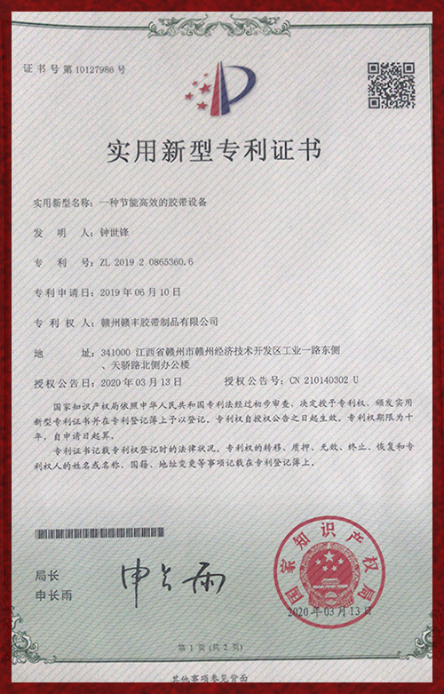 赣丰胶带专利证书